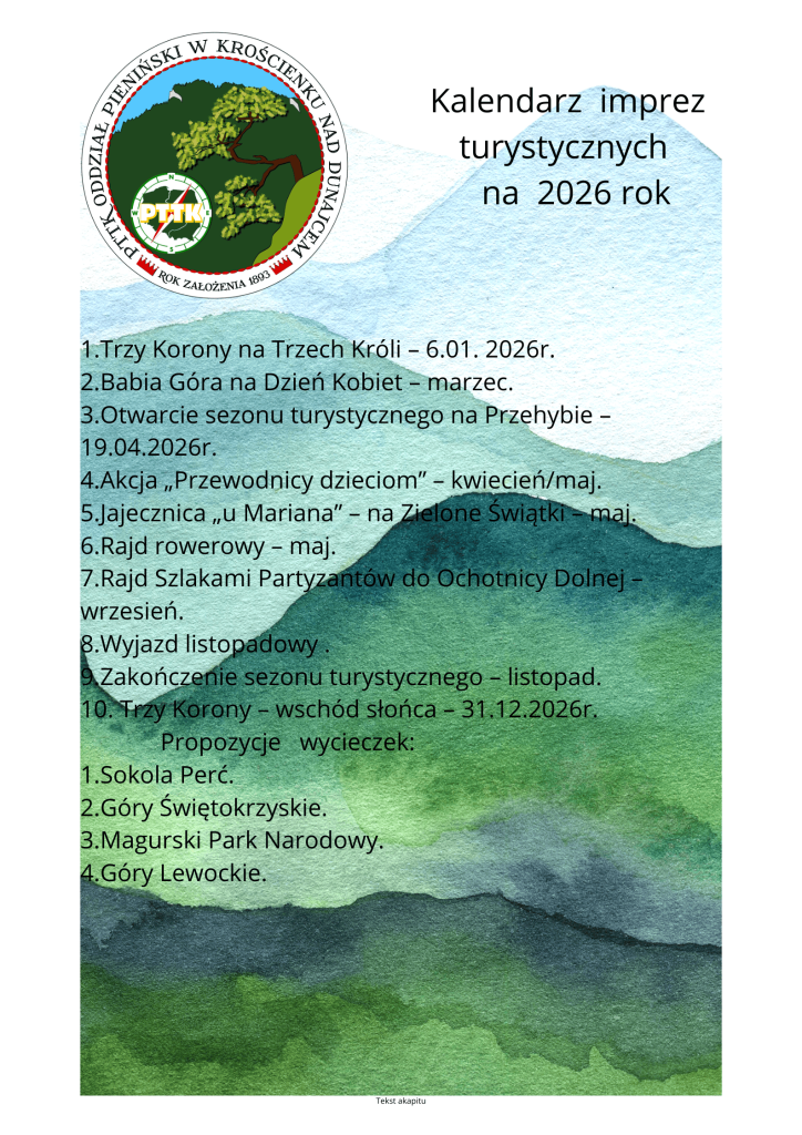Oto proponowany przez Zarząd harmonogram imprez.Zapraszamy do tworzenia przestrzeni turystycznej Towarzystwa